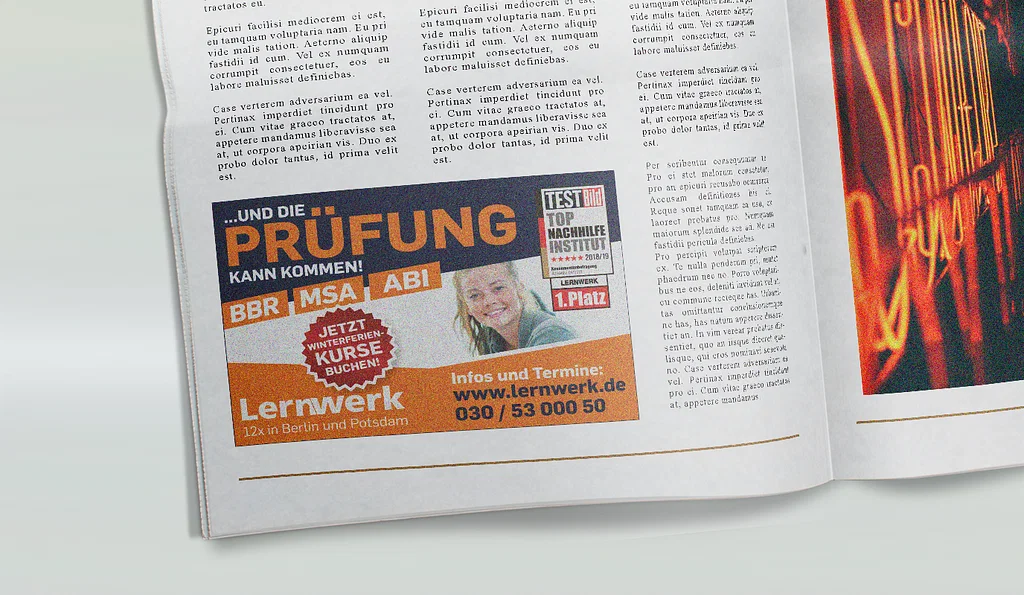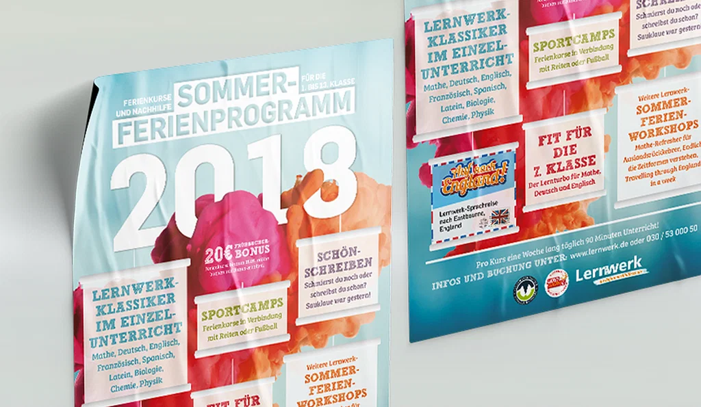 Das Nachhilfeinstitut Lernwerk besitzt mittlerweile 11 Standorte in und um Berlin. Die Betreuung umfasst bis heute sowohl vielfältige Online als auch Offline Projekte. Besonders in der Ferien und vor den Abiturklausuren, betreut PPAM die Gestaltung der Werbemittel und Kommunikationkonzepte für die Vorbereitungskurse.